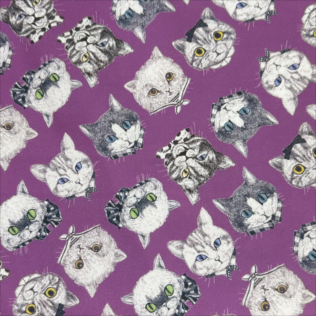 Cat Faces Cotton Oxford Fabric in purple by Illustrator Ringo, Imported from Japan