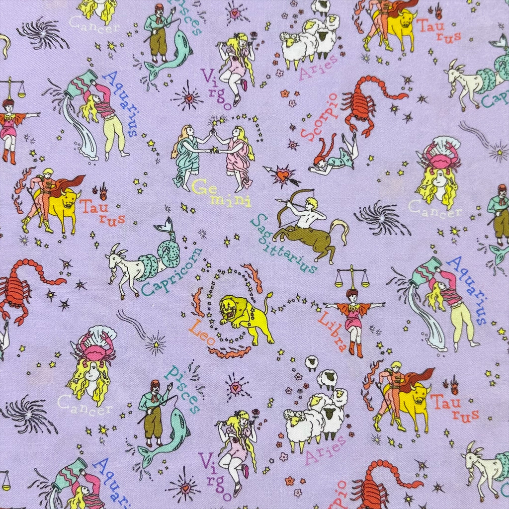 Fat Quarter My Star Sign Cotton Fabric in Purple by Nora is a quilt-weight cotton featuring illustrated zodiac-themed designs.