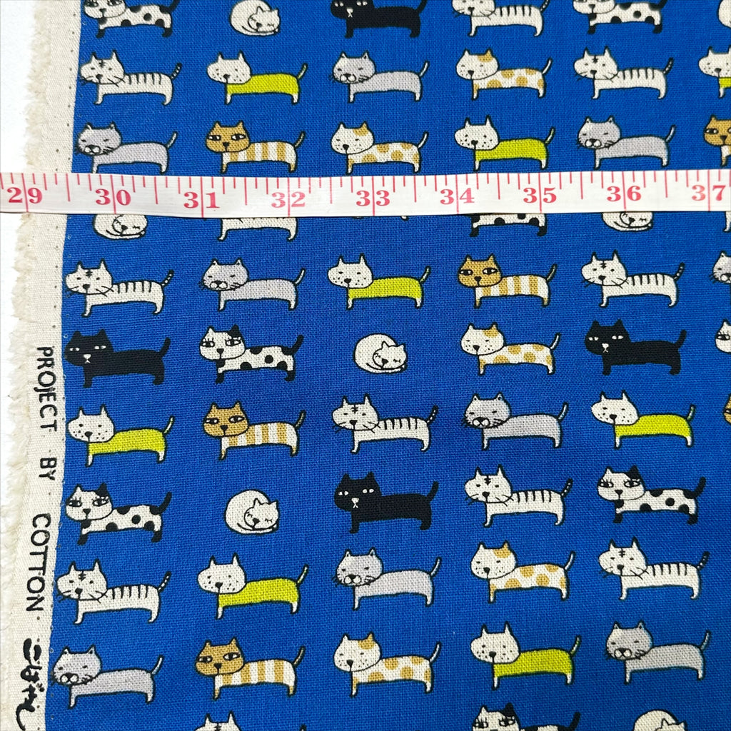 Cat Parade Canvas Fabric in Blue is a cotton linen blend fabric by Cotton Kobayashi, featuring a charming cat motif and imported from Japan. This medium-weight canvas is ideal for bag making, apparel, and home décor projects.