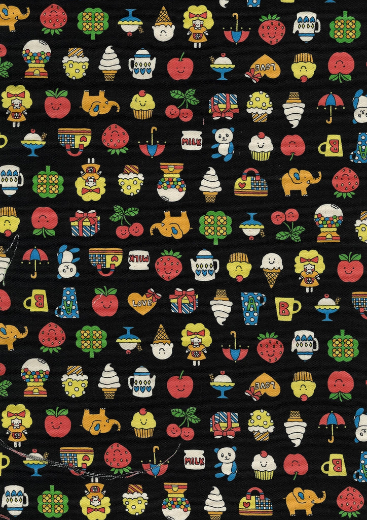 Retro School Cotton Oxford Fabric by Kokka features playful motifs of fruit, sweet treats, animals, and children on a mid-weight cotton Oxford, perfect for apparel, bags, and accessories.