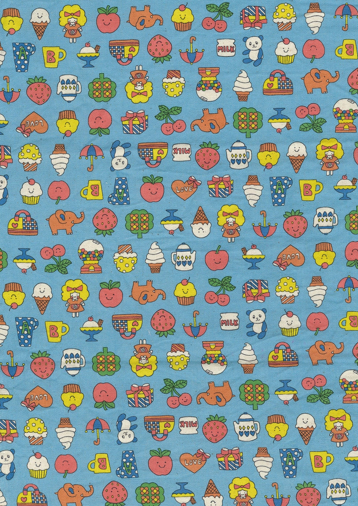 Retro School Cotton Oxford Fabric by Kokka features playful motifs of fruit, sweet treats, animals, and children on a mid-weight cotton Oxford, perfect for apparel, bags, and accessories.